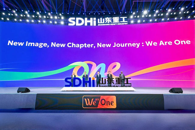 大會正式發(fā)布山東重工全球品牌標(biāo)識,任剛、滿慎剛、王志堅和戰(zhàn)略合作伙伴代表、海外員工代表共同為品牌標(biāo)識揭幕。